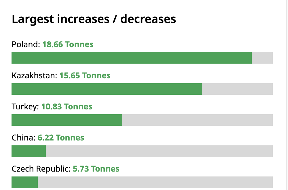 ワールド・ゴールド・カウンシルの2025年第2四半期データによると、ポーランドの金保有量は18.66トン増加し、カザフスタンが15.65トン増加してこれに続いた。中国人民銀行は堅調な推移を示し、保有量を6.22トン増加させた。