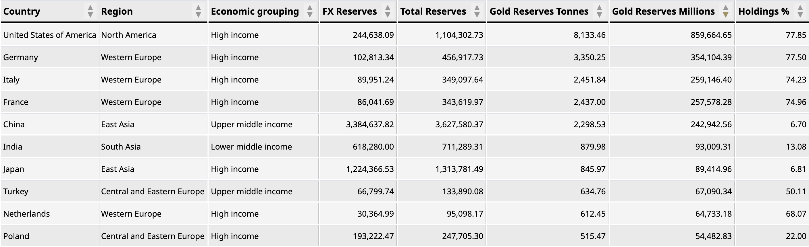 米国の資産準備金の77.85%は金で、その保有量は8,133トン。2位のドイツの3,350トンを大きく引き離し、続いてイタリアとフランスがそれぞれ2,452トンと2,437トンの金を保有している。