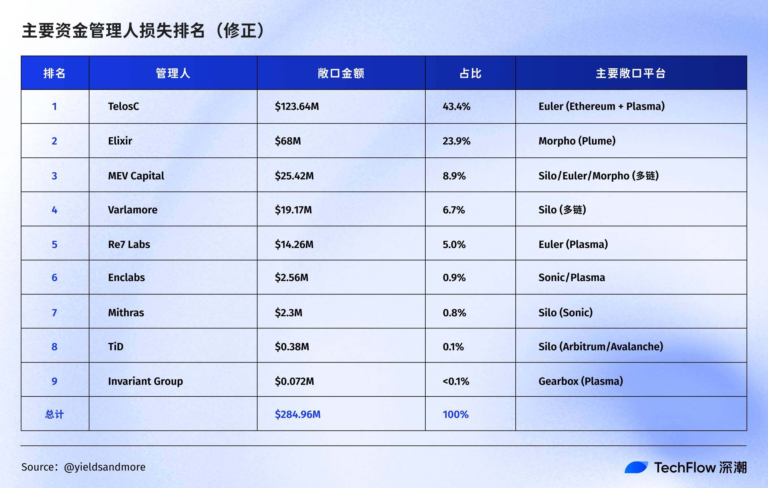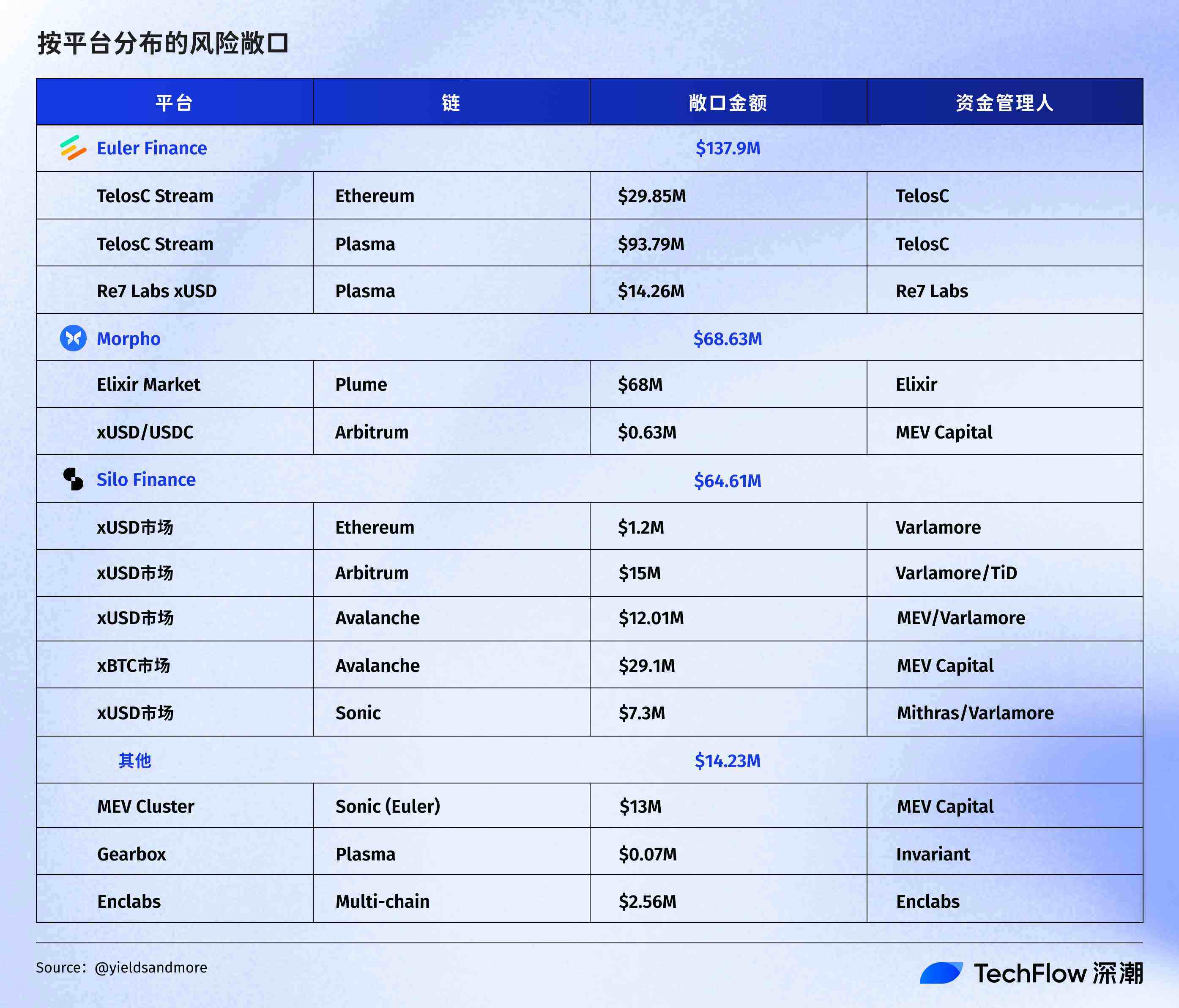 YAMの分析によると、2億8500万ドルの債務は複数のプラットフォームに分散しており、それぞれ異なる「キュレーター」(ファンドマネージャー)によって管理されています。具体的にどのプラットフォームがこの火薬庫に眠っているのか見てみましょう。
