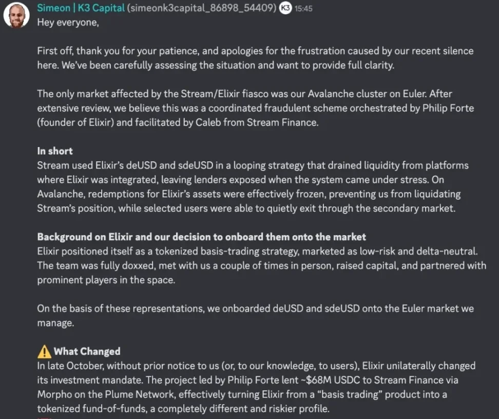 しかし、一部のキュレーター自身もこのパッケージ詐欺の被害者となりました。K3 Capitalもその一つです。オイラープロトコルを通じて数百万ドルの資産を運用していたこのキュレーターは、この爆発で200万ドルの損失を被りました。