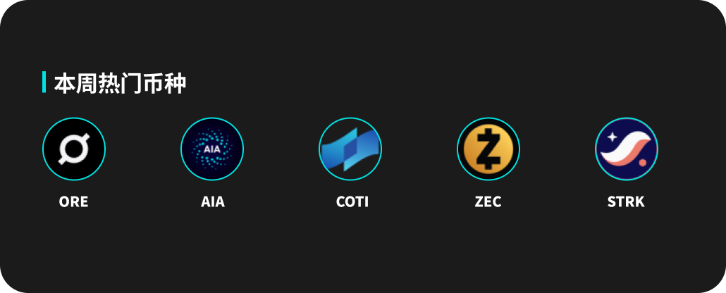 人気の仮想通貨の中で、QRE、AIA、COTI、ZEC、STRKはいずれも好調な動きを見せました。QREの価格は今週334%上昇しました。AIAは229.9%上昇しました。COTIは15.3%上昇し、24時間の取引量は4億2,433万枚でした。TAOとZECはそれぞれ今週12.5%と8.9%上昇しました。