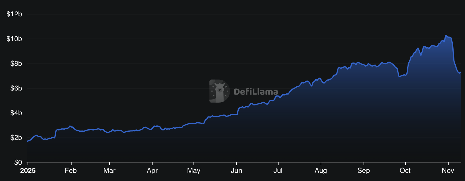 このようなプール型融資プラットフォームは、Aaveのような従来の融資市場よりも魅力的なリターンを提供することが多いため、当然ながら多くの投資を引き付けます。Defillama のデータによると、様々な事業者が運営するプール型融資プラットフォームの総規模は過去1年間で急速に拡大し、10月末から今月初めにかけて100億ドルを超え、現在は73億ドルに達していると報告されています。