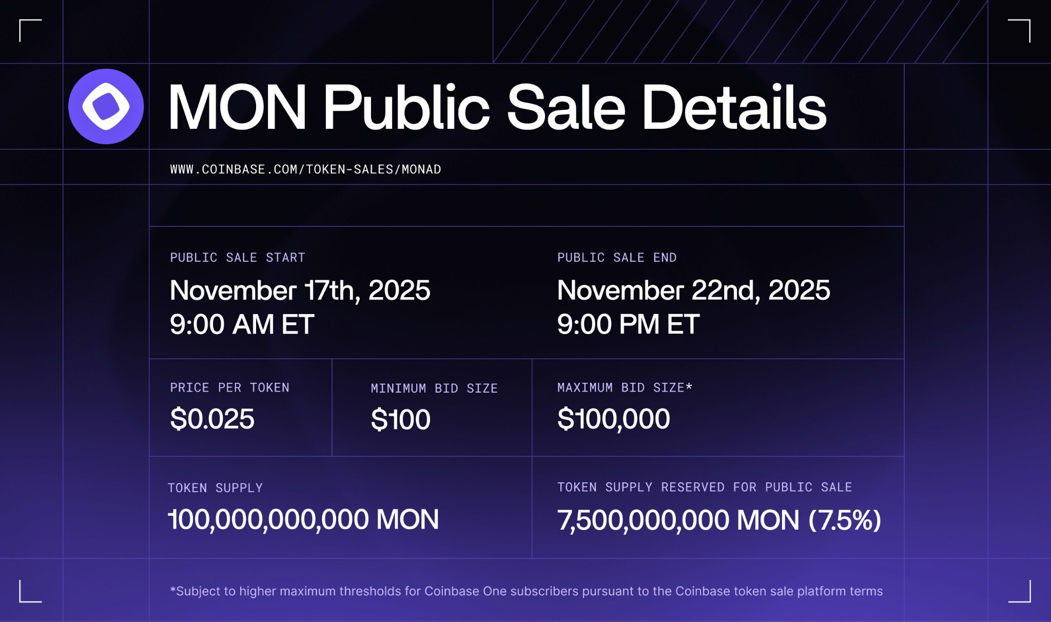 Coinbaseは先日、トークンのパブリックセール機能の開始を発表しました。最初のプロジェクトは、待望のMonadです。11月17日より、75億枚の$MONトークンが1枚あたり0.025ドルで一般販売されます。これは総供給量の7.5%に相当します。今回のパブリックセールラウンドにおけるトークンの価値は25億ドルです。一方、MonadはBinanceのプレマーケット市場で約0.051ドルで販売されており、時価総額は51億ドルに相当します。