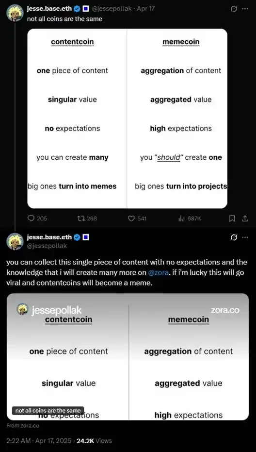 実は、Baseの公式ツイートの約1時間前、Jesseはコンテンツコインとミームコインの違いについてZoraにツイートし、それをコイン化していました。その後数日間、彼はコンテンツコインに関する自身の見解を熱心に共有し、1週間後、Zoraは独自のコインをローンチしました。