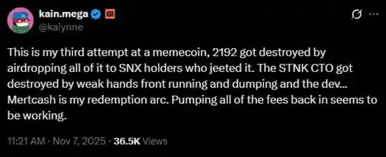 例えば、少し前にSolanaで登場したプライバシーをテーマにしたミームトークンMECは、HeliusのCEOである@0xMert_がライブ配信中に冗談を言ったことから始まり、SynthetixとInfinexの創設者である@kaiynneによって導入されました。当時、@kaiynneは3つ目のミームトークンであるMECを「償還」と呼んでいました。しかし、彼にできたのは、トークンによって得られたクリエイター収益を買い戻しに使うことだけで、それ以上のことは何もしていませんでした。