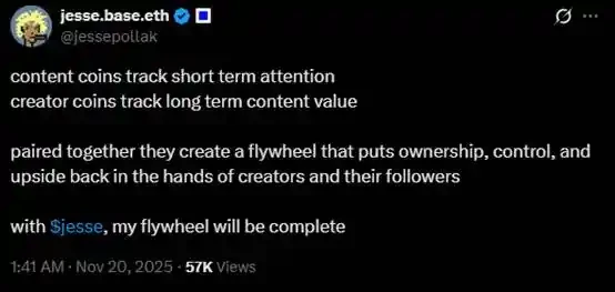 ジェシーはなぜ個人トークンを立ち上げたのでしょうか?Xについて彼はこう説明しています。「コンテンツトークンは短期的な注目度を追跡し、クリエイタートークンは長期的なコンテンツ価値を追跡します。この2つを組み合わせることでフライホイール効果が生まれ、所有権、管理権、そして収益権がクリエイターとそのファンに還元されます。$jesseによって、私のフライホイール効果は完璧なものになるでしょう。」