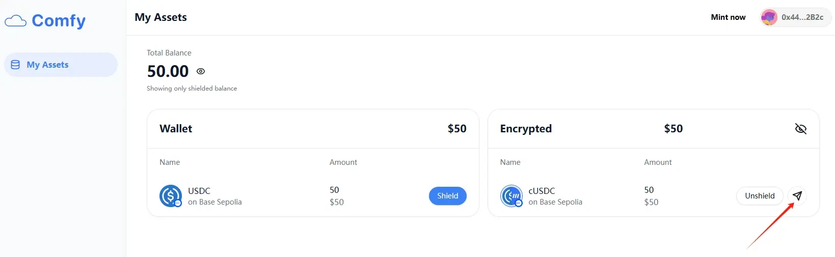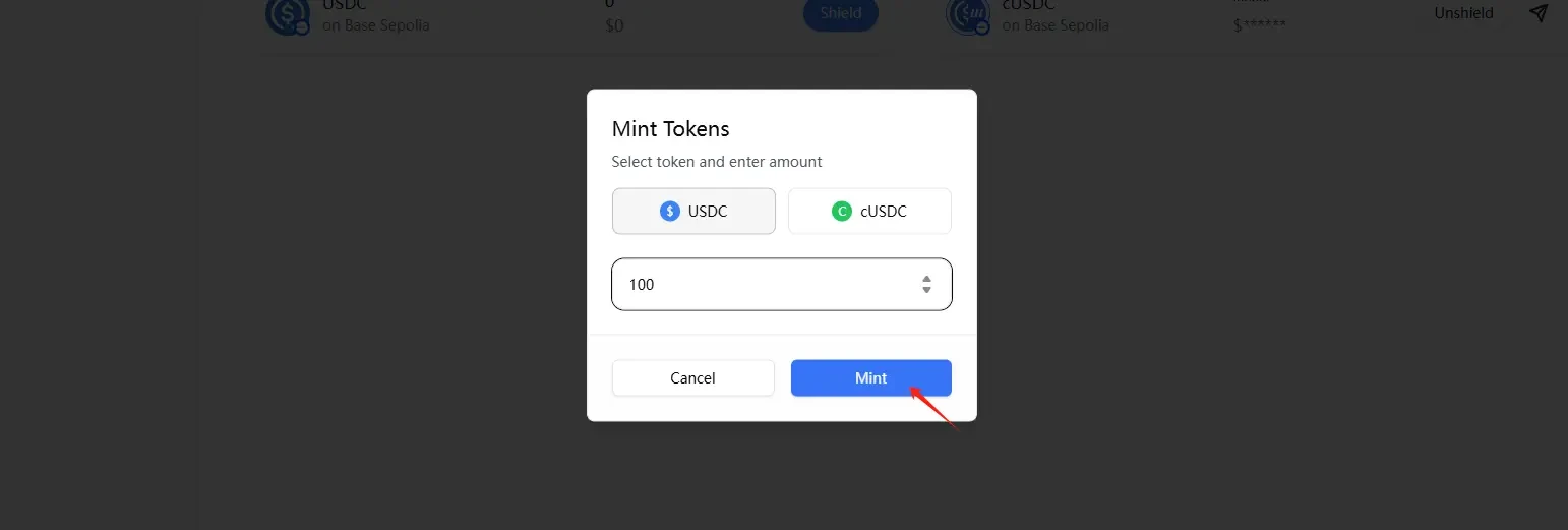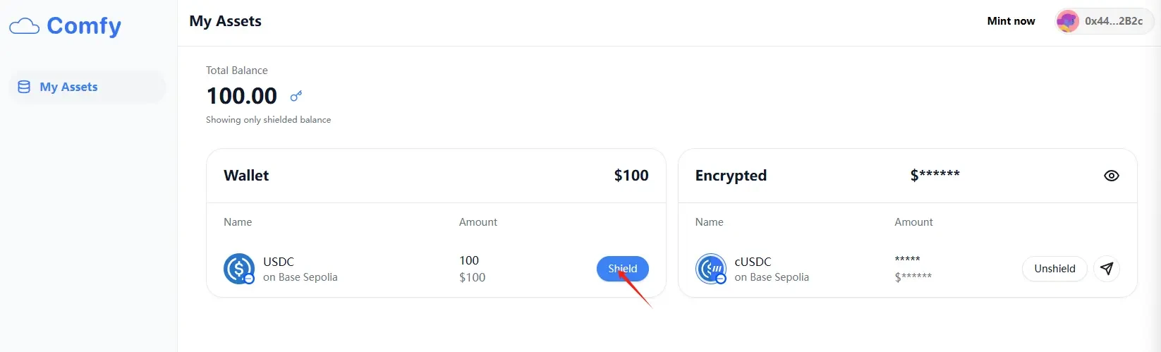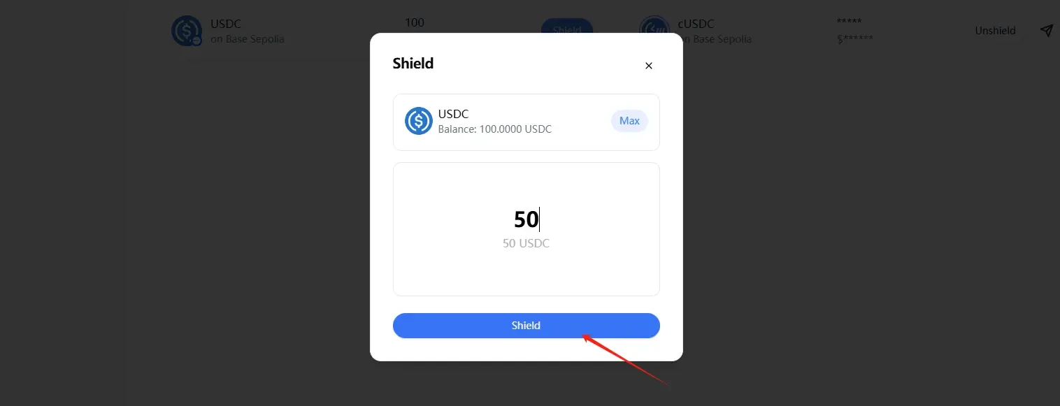 ステップ 4. 「シールド」を選択して USDC の一部を cUSDC に交換し、「シールド解除」をクリックして cUSDC の一部を USDC に交換します。
