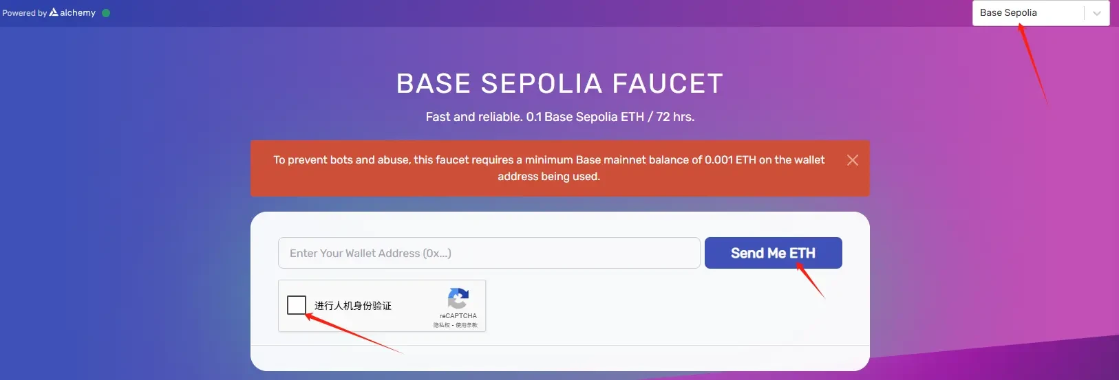 ステップ 1. テスト トークンを請求するための Web サイト (リンク: https://www.alchemy.com/faucets/base-sepolia ) にアクセスし、「Base Sepolia」テスト ネットワークを選択して、人間による検証を完了し、アドレスを入力してテスト トークン ETH を請求します (請求するには、Base メインネットのウォレットに 0.001 ETH が必要です)。
