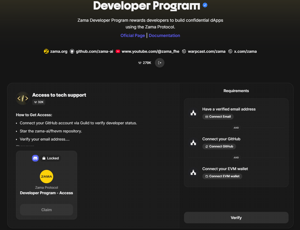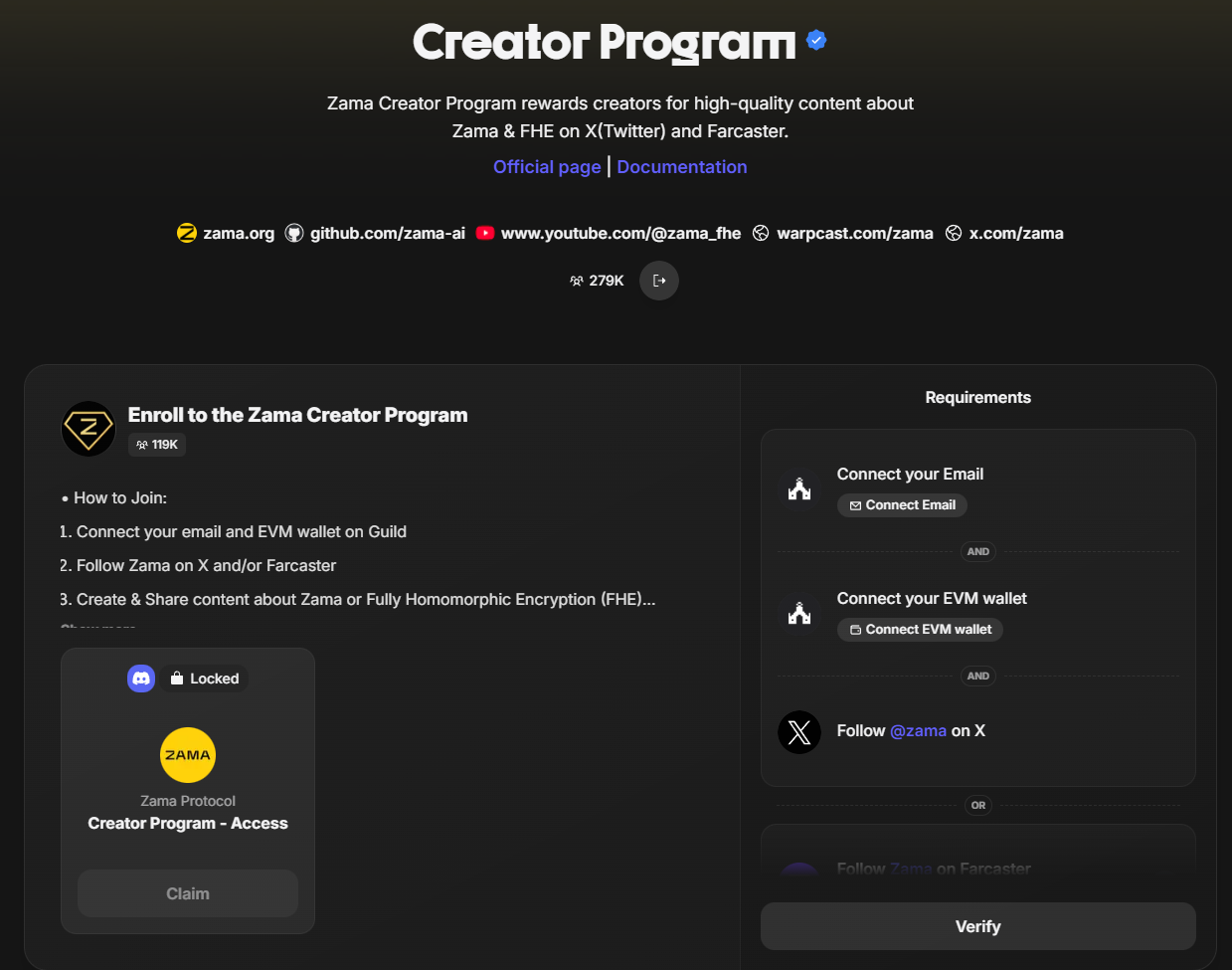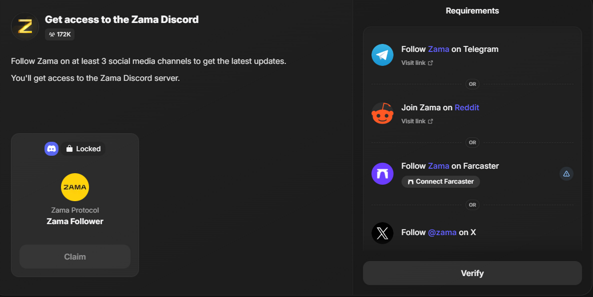 基本タスク:ウォレットをZamaギルドに送る。4つの公式コミュニティのうち3つに参加することでこのタスクを完了できます。また、公式Discordチャンネルに参加してアイデンティティロールを取得することもできます。