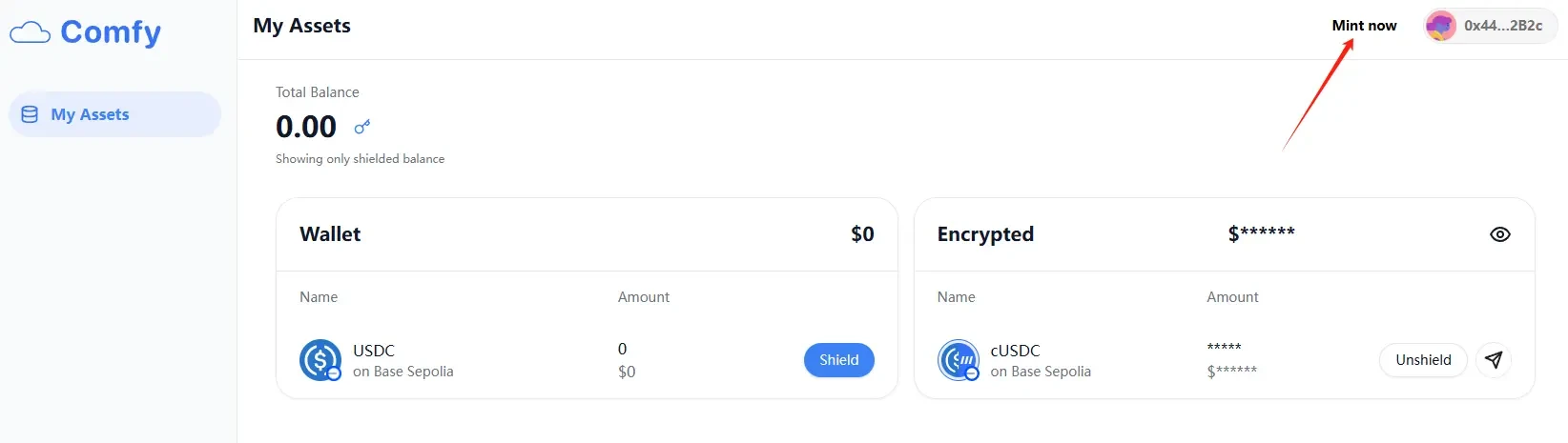ステップ 3. Comfy プロジェクト インタラクション Web サイト (リンク: https://comfy.inco.org/ ) にアクセスした後、「ウォレットを接続」をクリックし、「今すぐ Mint」を選択して Mint USDC にアクセスします。