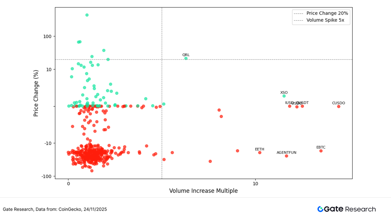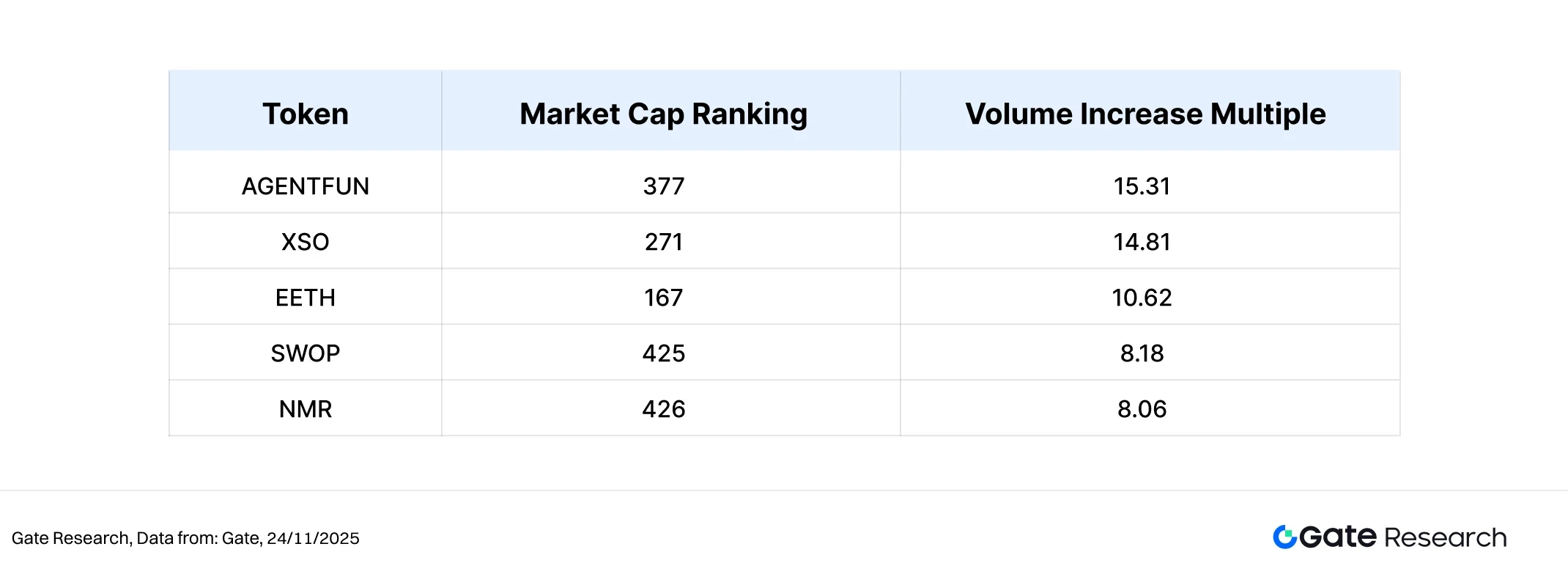 図5:AGENTFUN、XSO、EETHなどのトークンの取引量はこの期間に大幅に増加しましたが、そのほとんどはトレンドの反発を形成せず、取引量と価格の乖離を示しており、市場資金がより短期的で流動性志向であることを強調しています。
