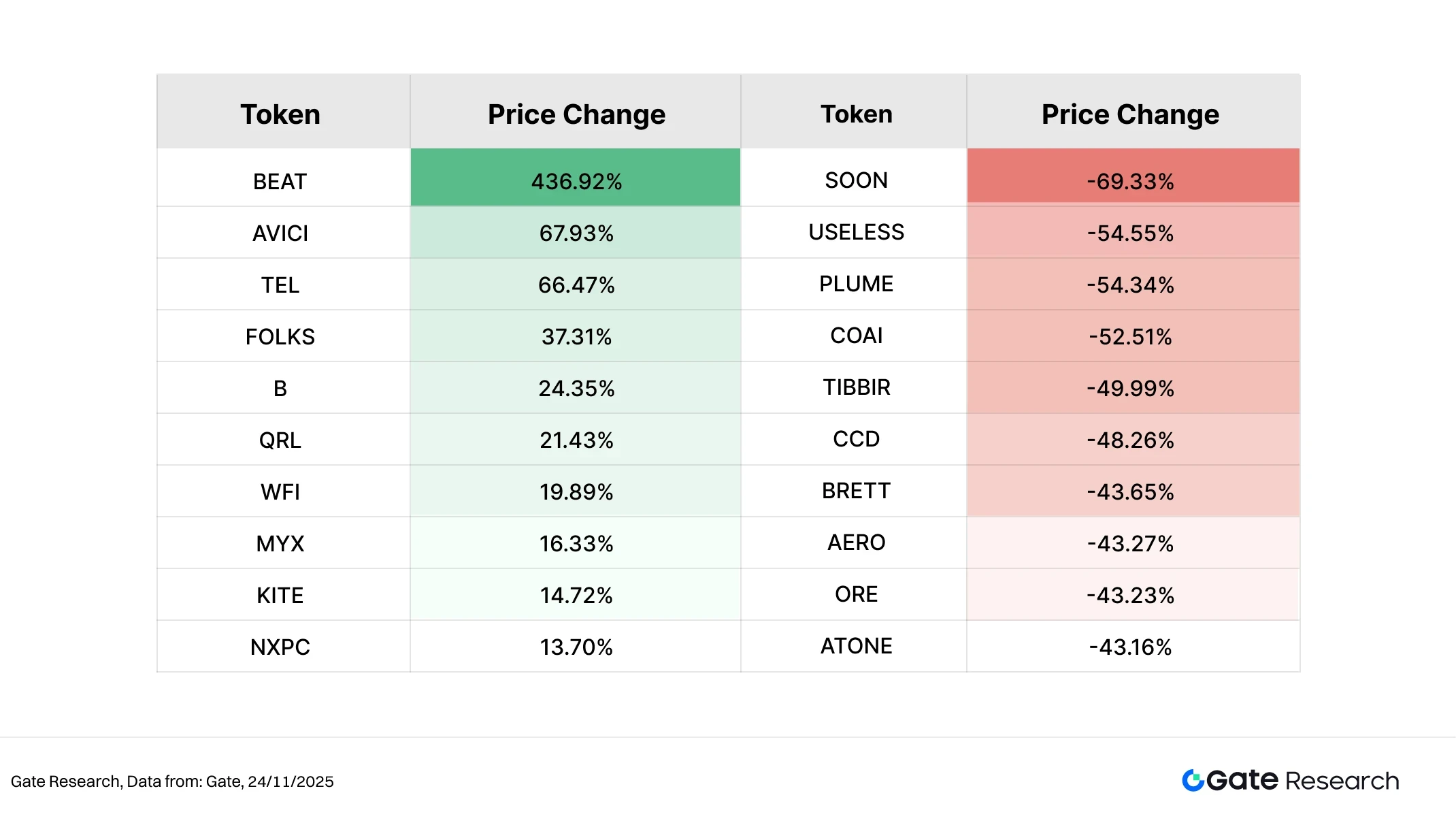 2025年11月11日から11月24日までの期間を振り返ると、暗号資産市場はAIバブルへの懸念、好調な雇用統計、そして利下げ期待の下方修正を受け、包括的な調整局面を迎えました。しかし、BTCとETHは11月19日と20日の安値からテクニカルな回復を見せ、市場全体としては統合と底入れの様相を呈しました。同時にオンチェーン資金は再分配局面に入り、Arbitrumは引き続き資金流入を増やし、SolanaやBaseといったエコシステムも回復の兆しを見せました。一方、EthereumメインネットとHyperliquidからは多額の資金流出が見られました。オンチェーン上の株式とETFの規模は1,000万ドルに迫り、Arbitrumは機関投資家レベルの決済ハブへと成長を遂げつつあります。時価総額上位500トークンの平均下落率は約15%で、中大型トークン(時価総額100~200)の下落幅が最も大きく、中小型トークンの変動幅も最も大きかった。BEATは436%の下落を記録し、最も回復力のあるトークンとなった。一方、AVICIやTELといったテーマ型トークンも上昇した。SOON、USELESS、PLUMEといった過熱気味の資産は50~70%下落し、「高ベータの後退と構造的差別化」の特徴を反映した。