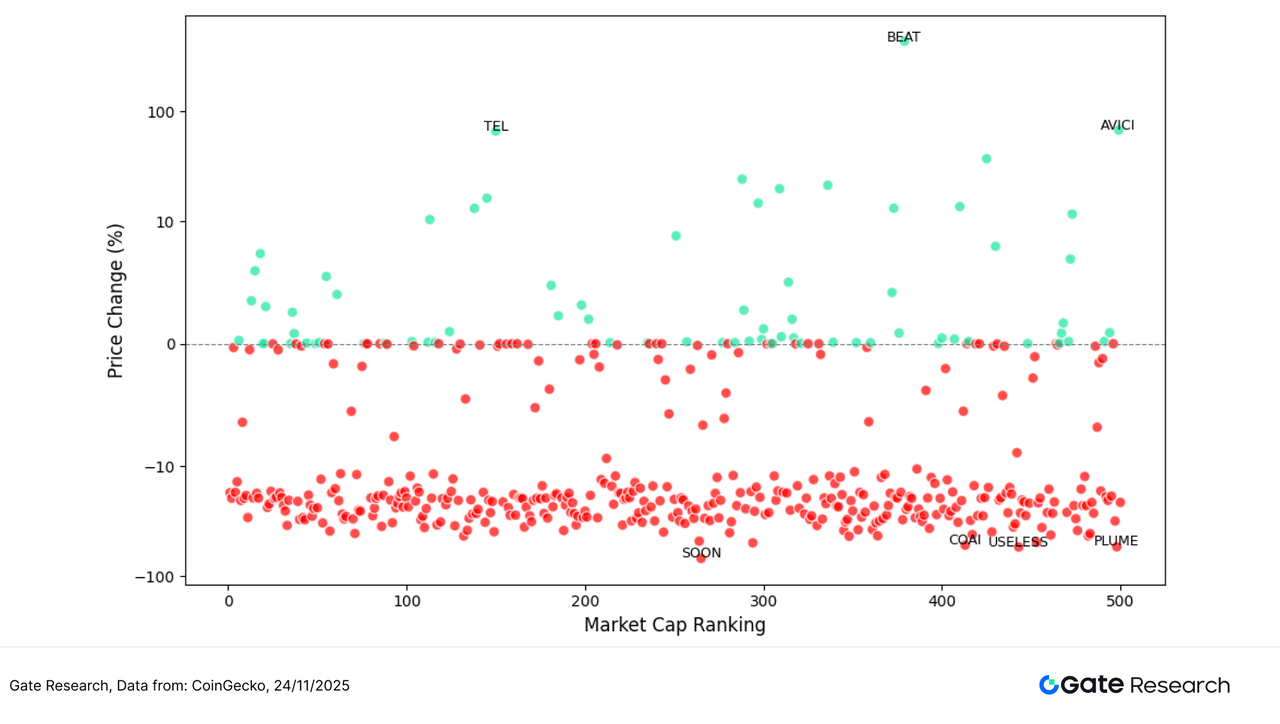 今回の市場活動におけるトークンのパフォーマンスの構造的特徴を観察するため、本稿では時価総額上位500トークンの散布図を示します。横軸は時価総額ランキング(左に行くほど時価総額が大きい)、縦軸は11月11日から11月24日までの価格変動を表しています。図中の各点はトークンを表し、緑は上昇、赤は下落を示しています。