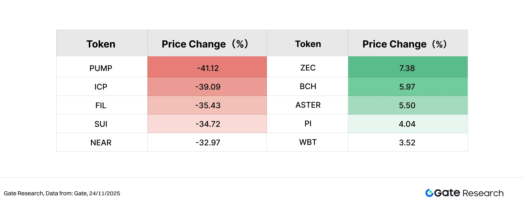 CoinGeckoのデータによると、2025年11月11日から11月24日まで、AIセクターの「バブル」への懸念、予想を上回る雇用統計、利下げ期待の大幅な下方修正といったマクロ経済要因により、世界的なリスク資産は弱含みとなった。暗号資産市場も圧迫された。価格動向を見ると、BTCとETHは11月19日と20日の安値から反発し、それぞれ86,600ドルと2,780ドルから2,820ドルまで上昇したが、全体としては依然として調整局面にあった。一部のトークンはトレンドに逆行し、力強いパフォーマンスを見せた。[1]