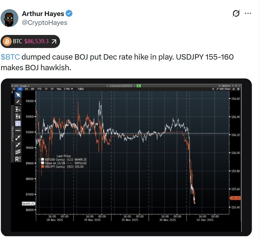 BitMexの創設者アーサー・ヘイズ氏は、ビットコインの最近の下落は、12月に予定されている日本銀行の利上げの可能性と密接に関連していると指摘した。米ドル/円の為替レートが155~160円のレンジに上昇したことで、日本銀行はよりタカ派的な姿勢を取らざるを得なくなり、この変化は世界的な流動性を直接的に引き締め、ビットコインに短期的な圧力をかけた。