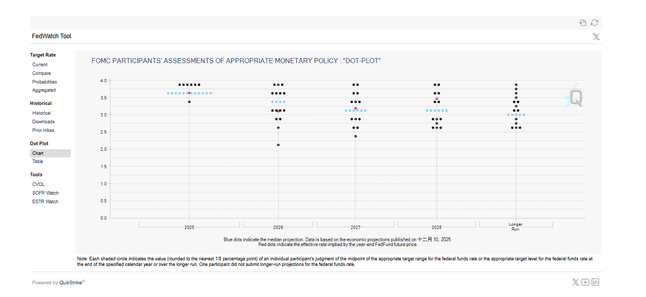 これまでの意見の相違だけでは不十分だったかのように、最新のドットプロットは市場の警戒感をさらに強めています。現在の予測では、2026年と2027年にそれぞれ1回の利下げのみが行われ、長期政策金利は3%前後にとどまるとされています。これは投資家の予想よりも大幅に保守的なものです。労働市場指標が弱いにもかかわらず、予測は9月の最新版からほぼ変わっていないため、委員会メンバー間の大きな意見の相違が浮き彫りになっています。