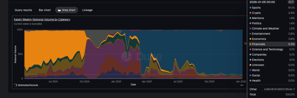 polymarket-volume-dunePolymarketの流動性優位性は2025年後半に加速して拡大し、週次の名目取引量は継続的に上昇し、スケール化が信頼できる価格発見の重要な基盤であることを浮き彫りにしています。(Dune Analytics)