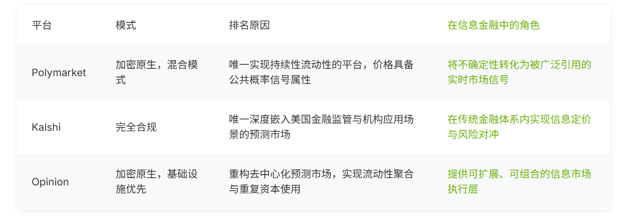 総合的に見ると、これら3つのプラットフォームは、異なる層面から情報金融の形成経路を描き出しています。Opinionは、持続的な流動性と現実世界での使用をサポートするために、分散型予測市場がどのように再設計されるかを示しています。Kalshiは合法性を規制された金融システムに導入します。Polymarketは、流動性が臨界規模に達した後に何が起こるかを明確に示しています。この最終的な飛躍こそが、なぜ流動性がInfoFiの中心にあるのか、そしてなぜPolymarketが情報金融を理解するのに理想的な出発点なのかを説明しています。