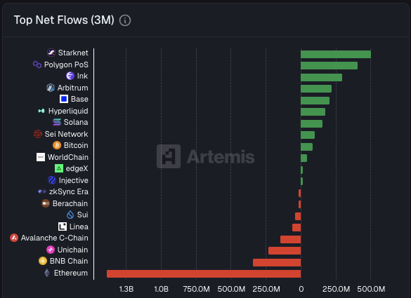 Starknetを単純にブロックチェーン界の「マイナー愛好家」の集まりと見なしてはならない。実際、Starknetは外部資金の支持を得ており、かつ定着率が高い。Artemisのデータによると、Starknetの3ヶ月間の資金純流入量は5.042億ドルに達し、ブロックチェーンの中で首位に立ち、2位のPolygonとは1億ドルの差をつけ、SolanaやBSCなどのブロックチェーンを大きく引き離している。