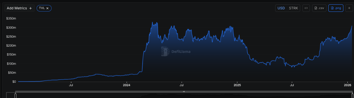 しかし、1年以上の臥薪嘗胆を経て、Starknetは現在、ほとんどのL1と互角に戦えるようになった。DeFiLlamaのデータによると、StarknetのTVLは2025年9月から回復し始め、現在は3億ドルを超え、2024年の水準に戻っている。ブロックチェーンランキングでは22位に位置し、Monad、Scroll、Linea、Seiなどの一連のL1とL2を上回っている。