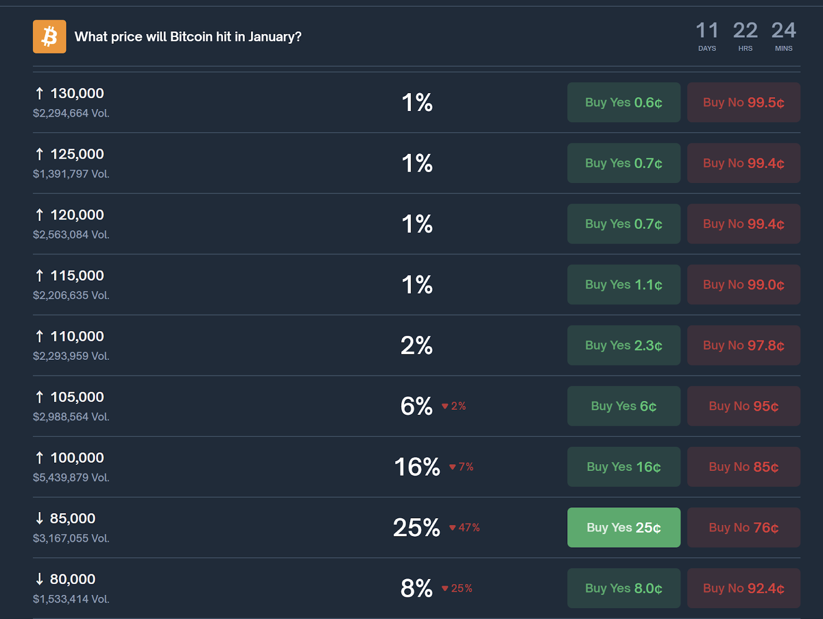 これらのマクロダイナミクスは、予測市場にますます反映されている。Polymarketプラットフォームでは、最近のボラティリティ急騰の影響を受け、1月のビットコイン価格契約の価格は大幅に調整された。1月にビットコインが10万ドルに達する確率は約15%に低下し、10万5,000ドルや11万ドルといったより高い目標の確率は一桁台にとどまっている。