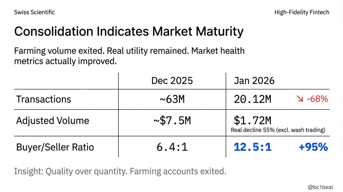 表面のデータを見ると、状況は楽観的ではありません:取引件数は68%減少、取引量は77%減少しています。しかし、本当に重要なのはその背後にある統合プロセスです。Artemisの分析によると、12月の取引量の約47%は非自然的な「刷量行為」によるものであり、これを除外すると、実際の減少幅は55%に近いです。同時に、売り手と買い手の比率はほぼ倍増し、6.4:1から12.5:1に上昇しました。刷量アカウントは退出し、真の需要が残り、生き残った各サービスプロバイダーはより多くの実際のユーザーにサービスを提供しています。これは典型的な「量から質への置き換え」です。