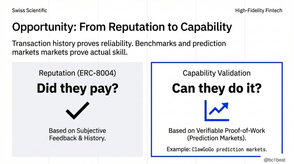 ERC-8004は、取引ベースのレピュテーションシステムを通じて、「彼らは支払いを確実に完了したか?」という問いに答えていますが、これは信頼の半分に過ぎません。欠けているもう半分は能力検証です:「彼らは本当にこの仕事をうまくこなせるのか?」完璧な支払い記録を持つエージェントでも、複雑なタスクを完了する能力が不足している可能性があります。予測市場は理想的な検証シナリオを提供します:結果は検証可能で、パフォーマンスは定量化可能です。ClawGoGo のようなプロジェクトは、主観的なスコアではなく、正確性を核心としたベンチマークインフラを構築しています。
