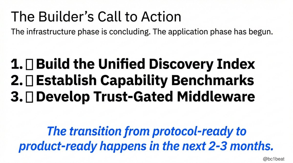 - 核心的見解:AIエージェント経済のインフラ(決済、信頼、ソーシャル)は初期段階で成熟し、本番環境に入ったが、プロトコルとユーザーをつなぐプロダクト層(発見メカニズム、能力検証など)はまだ空白の状態にある。現在は、構築者がインフラからアプリケーション開発へと移行する重要な窓口期である。
