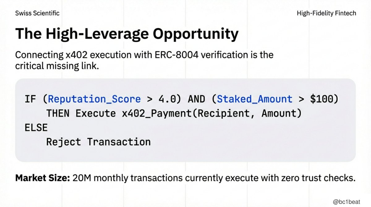 現在、月間約2,000万件の取引が、信頼検証なしで実行されています。これは「信頼ゲーティング支払いミドルウェア」に非常に高いレバレッジの機会を創出しています。その統合ロジックは非常に直接的です:x402支払いを承認する前に、ERC-8004のレピュテーションデータをクエリし、設定可能な閾値を設定し、決済後にフィードバックを提出します。例:もし Reputation_Score > 4.0 かつ Staked_Amount > 100ドル なら、支払いを実行する。それ以外は拒否。現在、このような本番レベルのSDKを構築しているチームはありません。最初に実装したチームが、これら2つのプロトコル間の重要な統合層を占めることになるでしょう。