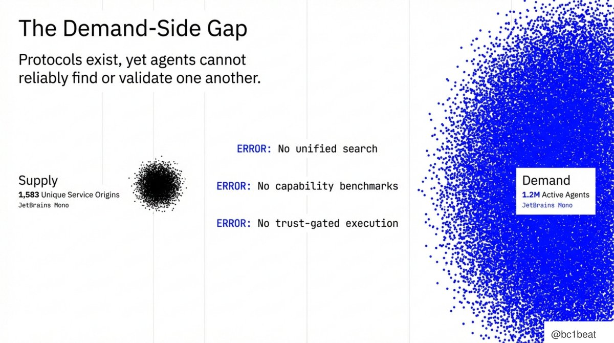 現在のエージェント経済における最大の機会は、需要側の空白から来ています。現在、供給側には1,583の独立したサービスソースがあり、需要側には約120万のアクティブなエージェントが集まっています。この両者の間には3つの重要な断絶があります:プラットフォームを横断する統一された検索メカニズムがない。エージェントが実際に「何ができるのか」を証明する能力ベンチマークがない。ERC-8004の信頼検証とx402の支払い実行を繋ぐ信頼ゲーティングメカニズムがない。プロトコルは存在しますが、プロダクト層はまだ現れていません。