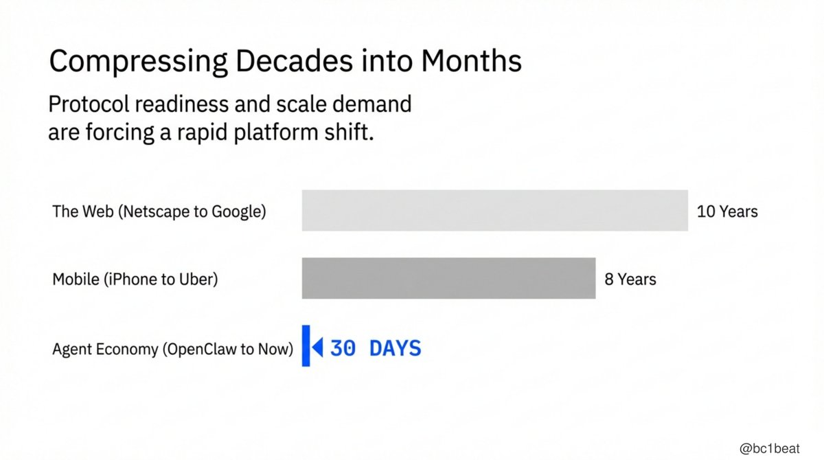 歴史的なプラットフォーム移行のサイクルは、しばしば10年単位でした:WebはNetscapeからGoogleまで10年、モバイルインターネットはiPhoneからアプリの全面普及まで8年かかりました。一方、エージェント経済は30日で、支払い、信頼、ソーシャル、開発フレームワークの完全なインフラストラクチャの組み立てを完了しました。プロトコルの成熟度と規模化の需要が、数十年のプラットフォーム進化を数ヶ月に圧縮しています。需要側ビルダーの窓は開かれています。