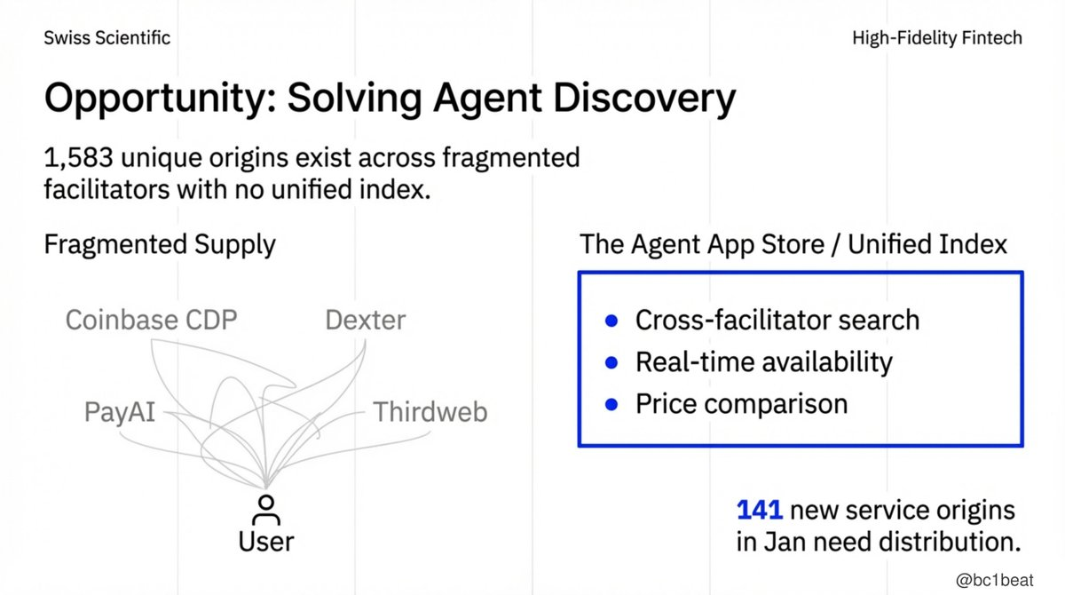 現在、エージェントがサービスを探すには、Coinbase CDP、Dexter、PayAI Network、thirdwebをそれぞれ個別にクエリする必要があり、各プラットフォームは異なるAPIと返却フォーマットを持っています。1月だけで141の新サービスがローンチされましたが、効果的な配信チャネルが不足しています。真の機会は、統一インデックス層を構築することにあります:クロスプラットフォーム検索、リアルタイム可用性、価格比較——「エージェント版App Store」です。決定的な発見体験を構築できる者が、エージェントビジネスの入り口となるでしょう。