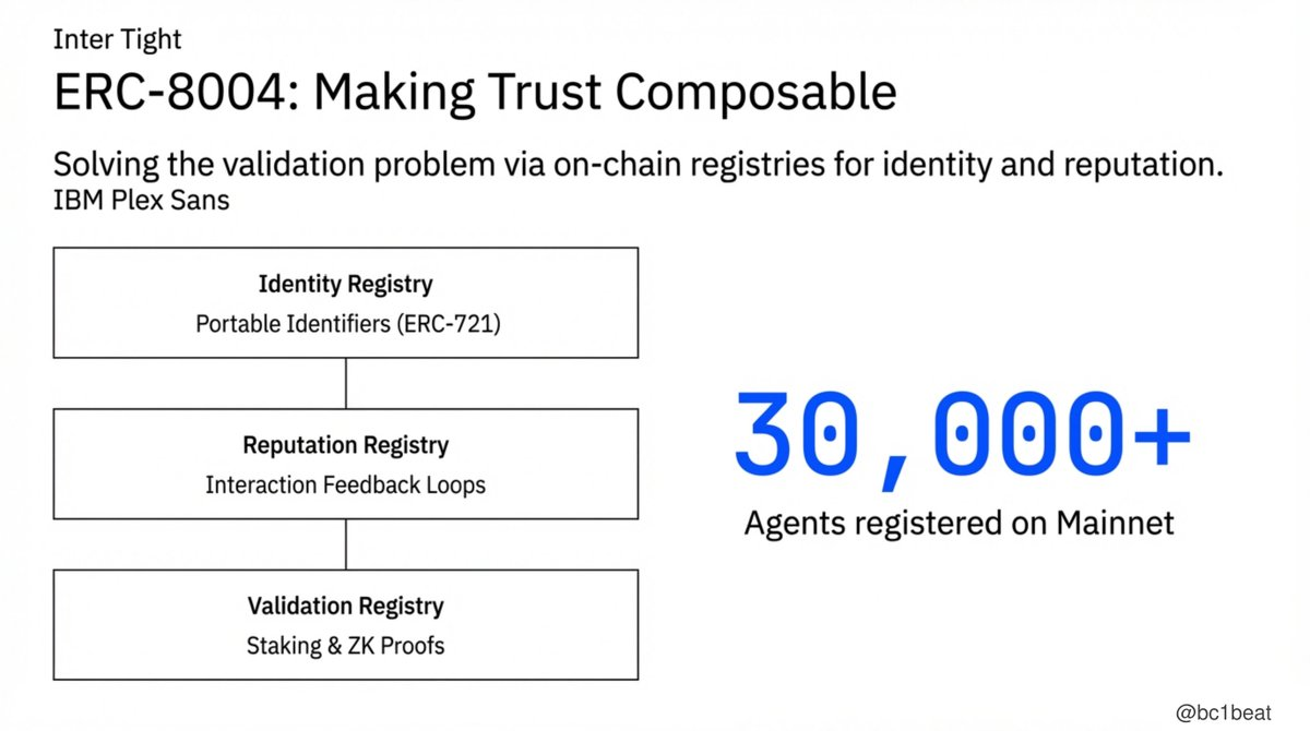 ERC-8004の核心的価値は、信頼をコンポーザブルなモジュールにすることにあります。これは3つのオンチェーン登録簿で構成されています:ERC-721ベースのID登録簿は、エージェントにポータブルで検閲耐性のあるIDを提供します。各インタラクションのフィードバックを記録するレピュテーション登録簿。そして、シンプルなステーキングメカニズムからゼロ知識証明まで、様々な信頼モデルをサポートする検証登録簿です。現在、3万以上のエージェントがメインネット上で登録を完了しており、信頼インフラは存在します。本当の問題は、それがどれだけ速く採用されるかです。