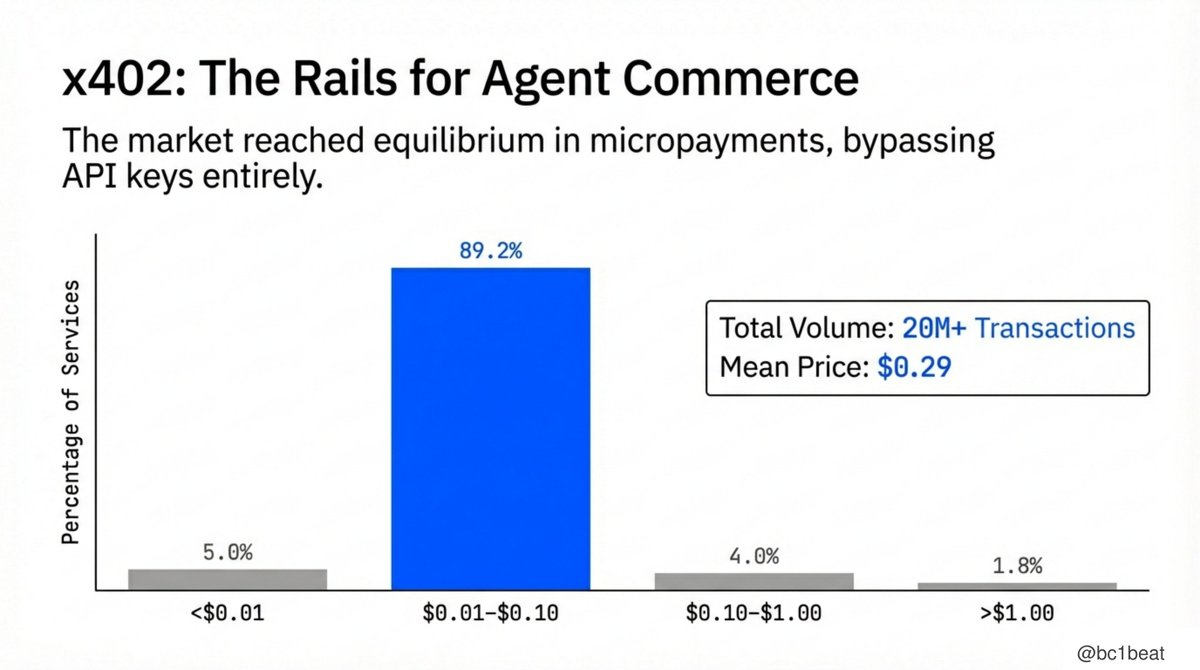 x402は自らの価格均衡を見出しました。現在、サービスの89.2%が価格を0.01–0.10ドルの間に設定しており、これはステーブルコイン決済コストがクレジットカード手数料よりもはるかに低い「スイートスポット」です。市場がマイクロペイメント経済モデルに収束するにつれ、x402の平均価格は1ヶ月で0.81ドルから0.29ドルに下落しました。2,000万件以上の取引量、APIキー不要、HTTPのネイティブサポート。これは、エージェントのビジネスに必要な支払いレールが本当に機能し始め、価格設定が適切であることを意味します。