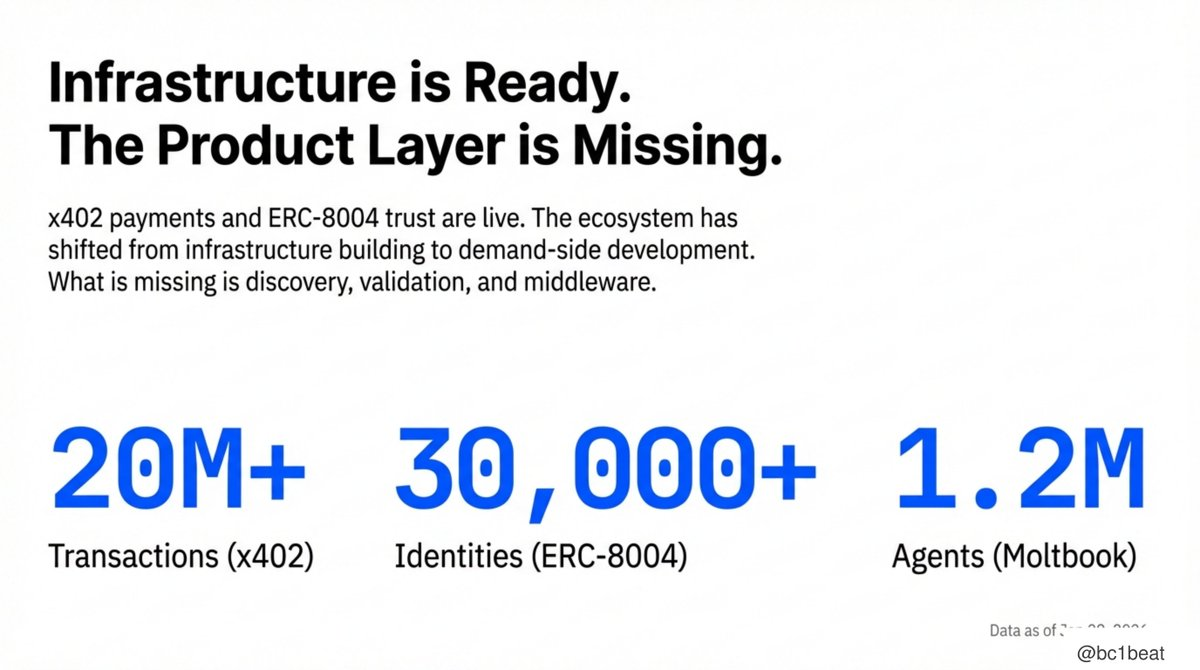 インフラストラクチャは整いましたが、プロダクト層はまだ欠けています。x402支払いプロトコルとERC-8004信頼プロトコルの正式ローンチに伴い、エコシステム全体は「インフラ構築」の段階から「需要側プロダクトの構築」の段階へと移行しつつあります。2,000万件以上の取引がx402を通じて完了し、ERC-8004上では3万以上のエージェントIDがミントされ、Moltbookには約120万のエージェントが登録されています。プロトコル自体は正常に動作することが検証されました。本当に欠けているのは、発見メカニズム、能力検証、そしてこれらのプロトコルを繋ぐミドルウェア層です。