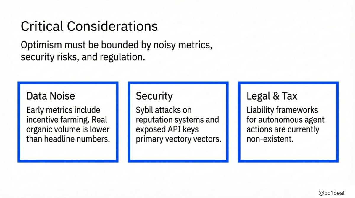 楽観的な感情は抑制を保つ必要があり、3つの重要なリスクを直視する必要があります。第一はデータノイズで、初期指標にはインセンティブによる刷量が含まれており、実際の有機的取引規模はトップデータよりも小さいです。第二はセキュリティ問題で、レピュテーションシステムに対するSybil攻撃やAPIキーの漏洩は依然として主要な攻撃ベクトルであり、Moltbookですでに関連する事件が発生しています。第三は法的・税務で、自律エージェントの行為に対する責任の帰属フレームワークはまだ存在しません。ビルダーは、理想的な状態を仮定するのではなく、敵対的環境を前提としてシステムを設計すべきです。