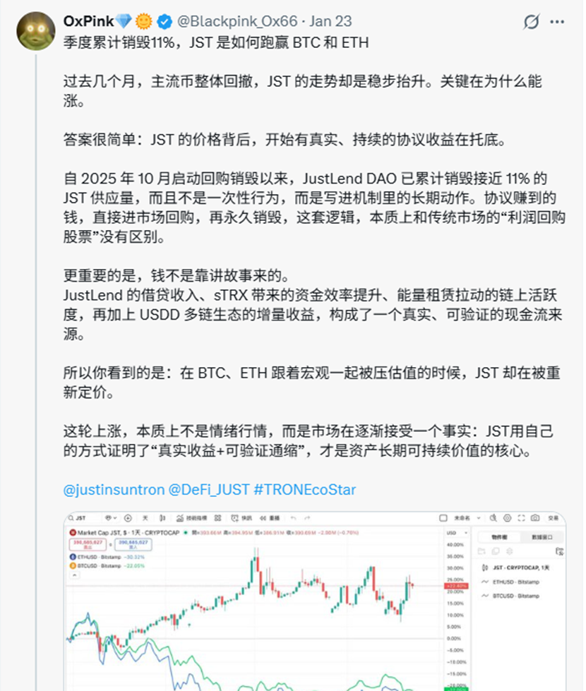 KOLのOxPink氏が述べたように、JST買戻し・焼却の核心ロジックは、伝統的な金融市場の「利益による自社株買い」と高度に一致しており、プロトコルが創造する実際の収益を、二次市場での買戻しと永久焼却を通じて、直接トークン価値に賦与し、エコシステム発展の果実を確実にトークン保有者に還元します。