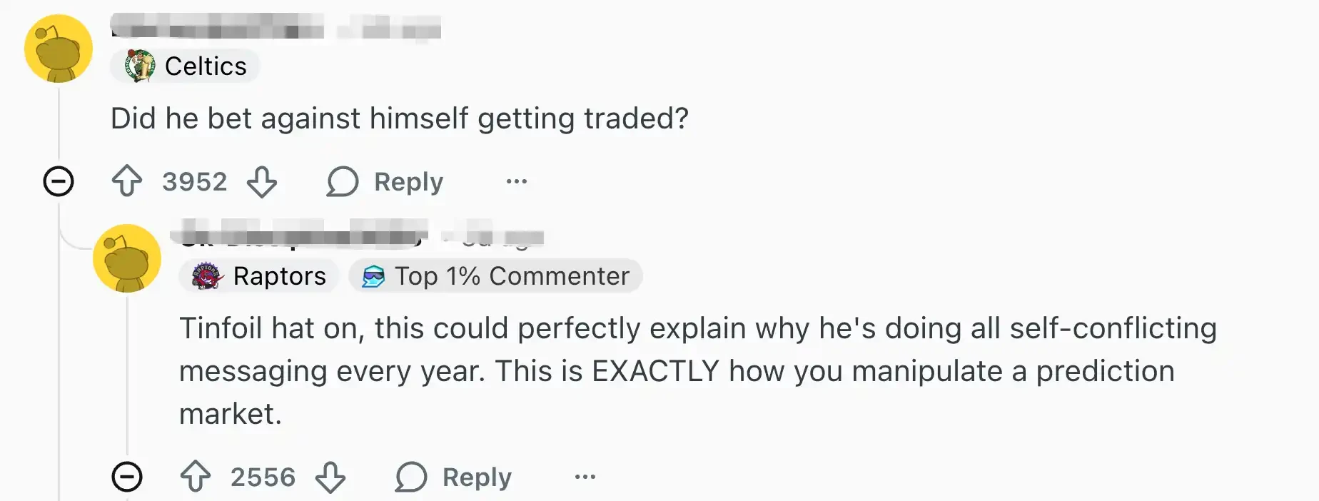提携声明の中で、KalshiはアルファベットがNBA関連のいかなる取引にも関与することを禁止されると強調した。しかし、真のリスクは依然として存在する。アルファベット自身による規制の意思、能力、強度、情報の透明性について、ファンは楽観視していない。多くのファンは陰謀論を唱え始め、アルファベット本人も彼の去就に関する取引に参加していたのではないかと疑っている。NBAのトレード期限日前に、アルファベットの発言が矛盾していたことを考慮すると、彼がインサイダー取引を操作し、ついでにファンをからかっていたのではないかと推測する者もいる。