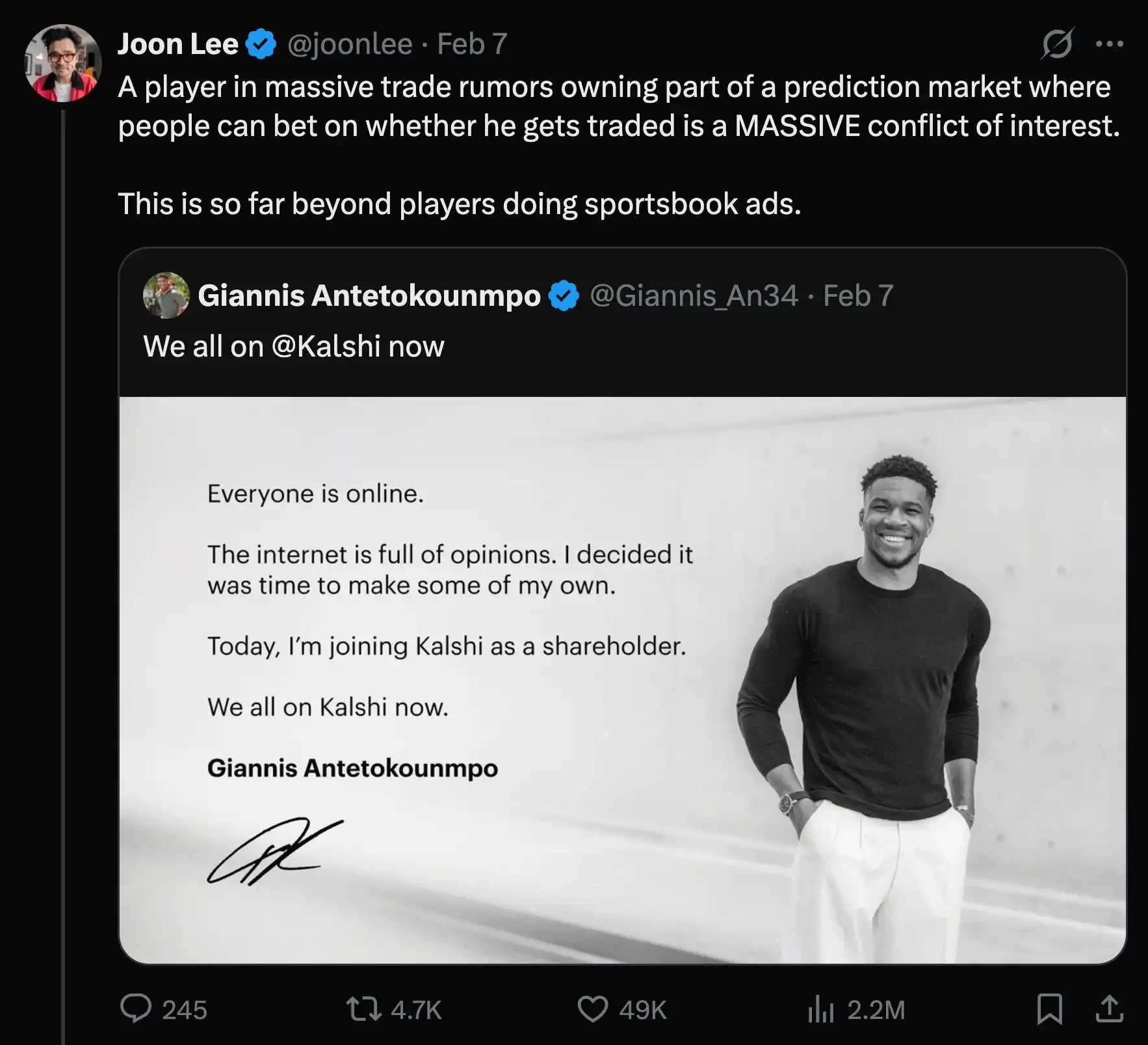 - 核心的な見解:NBAスター「Giannis Antetokounmpo」が予測市場プラットフォームKalshiの株主となったことは、利益相反とスポーツ倫理の問題に関わるため、広範な議論を呼んでいる。これは、スポーツリーグとギャンブル/予測市場が深く結びついた時代において、試合の公平性と公衆の信頼を維持することが直面する厳しい課題を浮き彫りにしている。