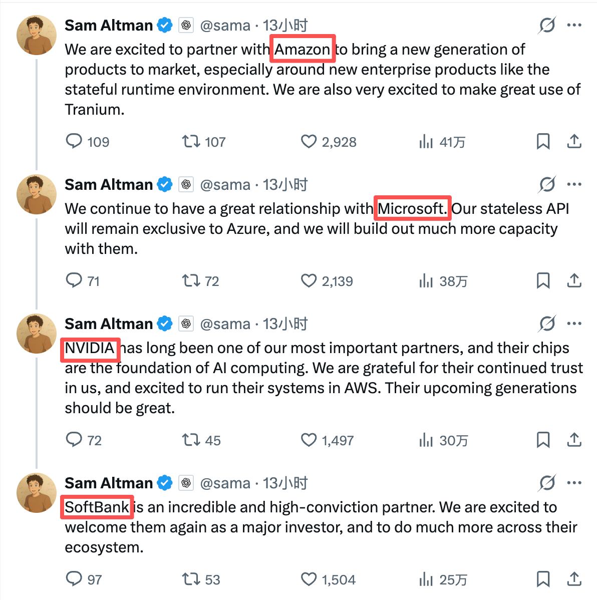 資金調達完了後、OpenAI創業者のSam Altman氏は個人のXアカウントで、三大出資者に相次いで感謝の意を表明しました。しかし、注目すべきは、Sam Altman氏の感謝の順序が、アマゾン、マイクロソフト、NVIDIA、ソフトバンクであったことです。今回出資していない「古い」株主であり重要なパートナーであるマイクロソフトの名前が、最も多くの出資を約束したアマゾンに続いて言及されました。