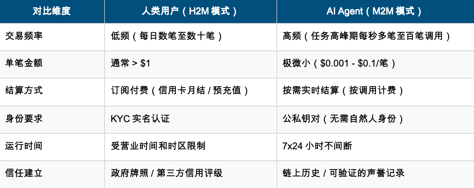 より深層のミスマッチはペイメントの粒度にある。従来のカードネットワークの価格設定ロジック(Stripeを例にとると、標準手数料率2.9% + $0.30/取引)は、人間の消費シーンを想定して設計されている——単一取引金額が十分に大きく、頻度が十分に低いことを前提としている。しかし、エージェントの典型的な行動はその逆である:高頻度、マイクロ額、呼び出しごとの課金。$0.001のAPI呼び出しは、クレジットカードシステムでは固定手数料すらカバーできない。
