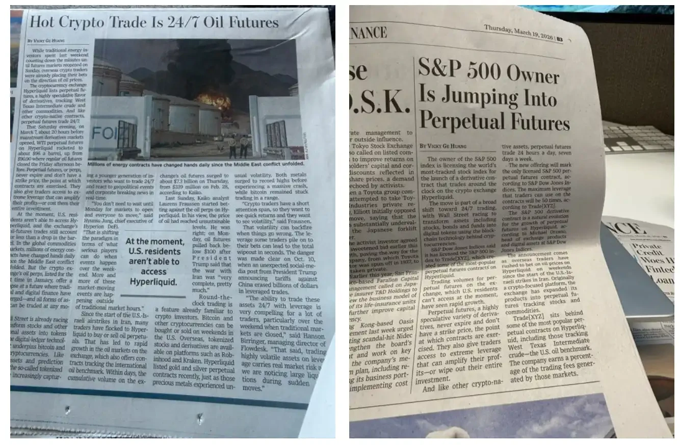 これはもはや理論上の仮説ではない。今年3月、イラン攻撃事件でパニックが広がった週末、世界中の主要証券取引所は扉を固く閉ざし、個人投資家はソーシャルメディア上で不安そうに情報を追うことしかできなかった。一方、Hyperliquidの原油無期限先物は24時間で10億ドルの取引高を記録した。