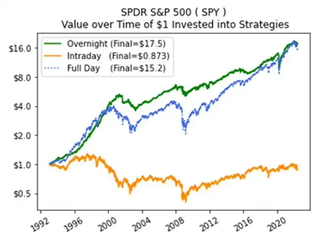 データは冷酷にこれを裏付けている。2019年から2022年の間、毎日寄り付きで高ボラティリティ銘柄として個人投資家に人気のAMC株を買い、引けで売却していた場合、元本はほぼゼロになり、損失は99.6%に達した。しかし、夜間のみ保有した場合、同期間のリターンは実に30,000%にも上った。