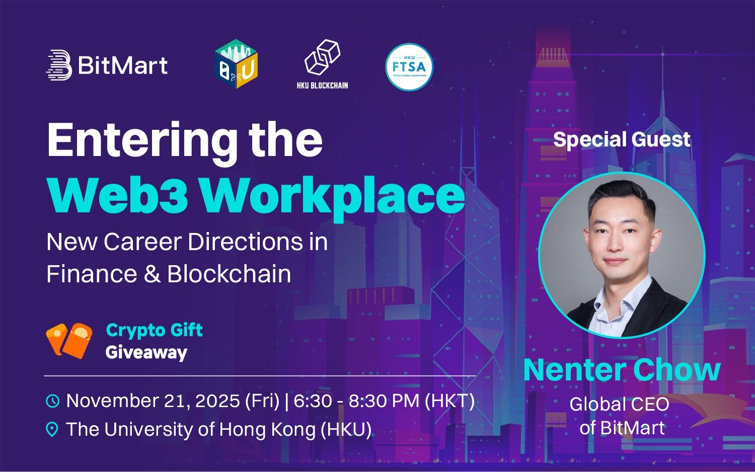 [홍콩] 2025년 11월 12일 – 세계적인 암호화폐 거래소 비트마트(BitMart) 는 11월 21일 , 0xU 홍콩 블록체인 클럽 과 협력하여 홍콩대학교(HKU) 에서 " 웹 3.0 직장으로의 진입 "이라는 주제로 행사를 개최합니다. 이 담화는 블록체인, 인공지능(AI), 디지털 금융이 세계 경제를 어떻게 재편하고 기술 산업에서 경력 개발의 의미를 어떻게 변화시키고 있는지에 초점을 맞출 것입니다.