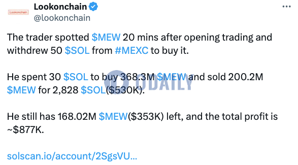 한 거래자는 시장 개장 후 3억 6,830만 MEW를 구매하여 US$877,000의 수익을 올렸습니다.