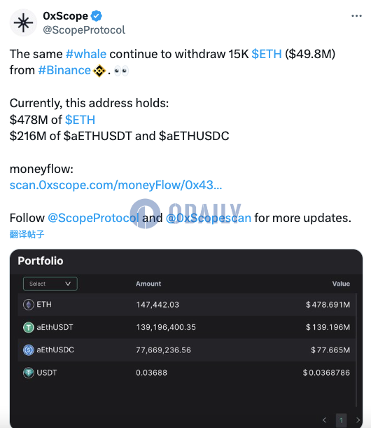 Odaily 스타 데일리 뉴스 0xScope 모니터링에 따르면 고래 한 마리가 다시 한번 바이낸스에서 15,000 ETH(약 4,980만 달러)를 인출했습니다. 현재 이 주소에는 4억 7,800만 달러 상당의 ETH, aETHUSDT 및 aETHUSDC 총 2억 1,600만 달러 상당이 보관되어 있습니다.