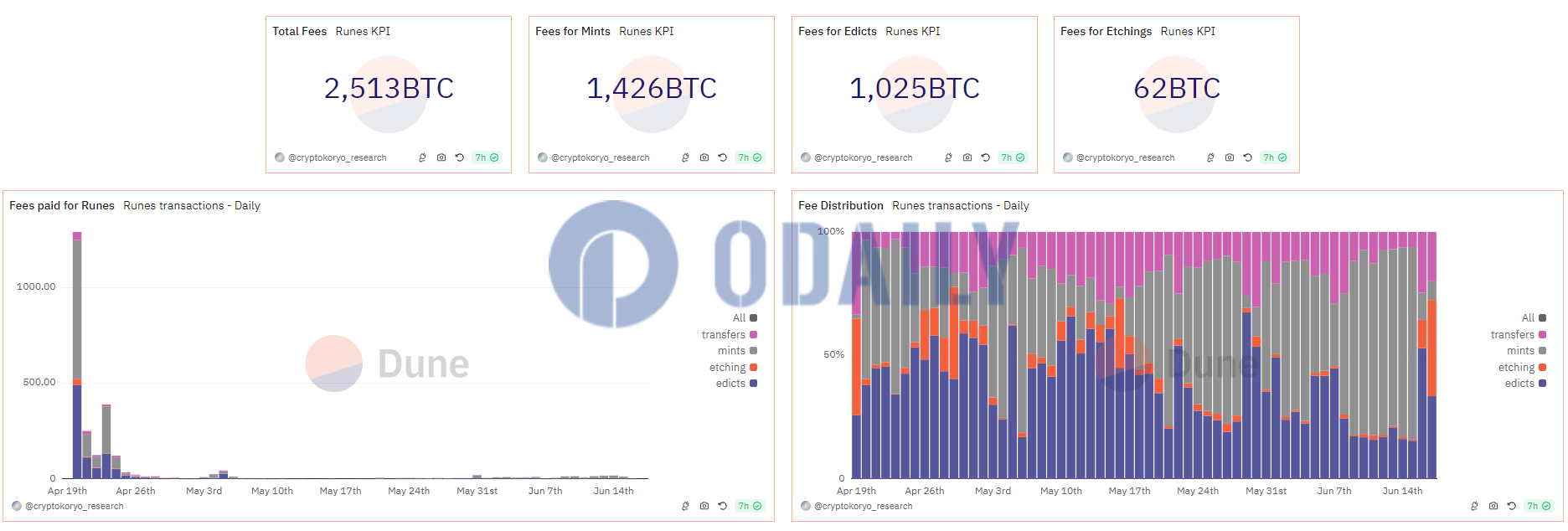Odaily 스타 데일리 뉴스 Dune 데이터에 따르면 Bitcoin Rune은 두 달도 채 안 되어 거래 수수료로 2,500개 이상의 비트코인(BTC)을 축적했으며 현재 1억 6,300만 달러 이상의 가치가 있는 2,513 BTC에 도달했습니다. (코인텔레그래프)