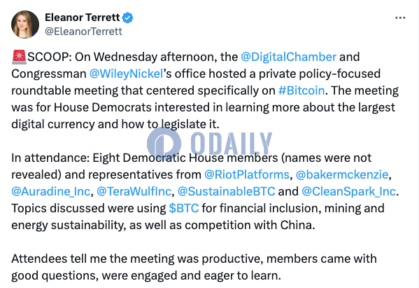 Odaily 스타 데일리 뉴스 Fox Business 기자 Eleanor Terrett이 폭로했습니다. 이 세션은 비트코인에 대해 더 자세히 알아보고 이를 입법하는 방법에 관심이 있는 하원 민주당 의원을 위한 것입니다. 참석자: 8명의 민주당 하원의원(이름은 밝히지 않음)과 Riot Platforms, Baker Mckenzie, Auradine, TeraWulf, Sustainable BTC 및 CleanSpark 임원. 논의되는 주제에는 금융 포용, 채굴 및 에너지 지속 가능성을 위해 BTC를 사용하는 것이 포함됩니다.