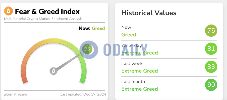 오늘 공황 및 탐욕 지수는 75까지 떨어졌고, 극한 탐욕에서 탐욕으로 수준이 바뀌었습니다.