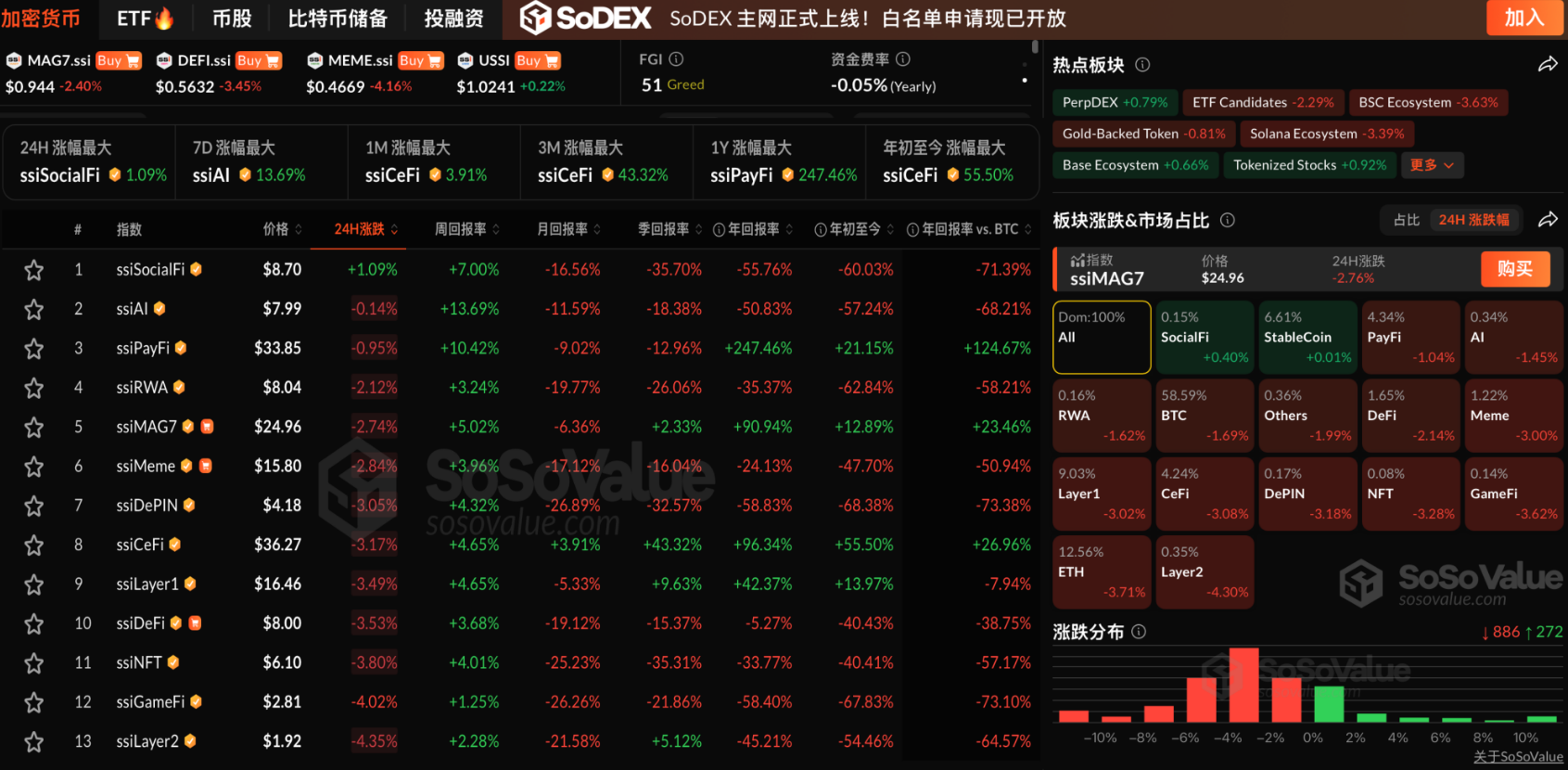 10월 29일 Odaily Planet Daily의 SoSoValue 데이터에 따르면, 암호화폐 시장의 여러 부문이 지속적으로 하락세를 보였으며, SocialFi 부문만이 24시간 동안 0.40% 소폭 상승하며 비교적 회복세를 유지했습니다. 해당 부문 내에서 톤코인(TON)은 1.39% 상승했습니다. 또한, 이더리움(ETH)은 3.71% 하락하여 4,000달러 아래로 떨어졌고, 비트코인(BTC)은 1.69% 하락하여 약 112,000달러로 후퇴했습니다.